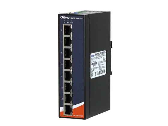 - Industrial 8-port unmanaged Gigabit PoE Ethernet switch